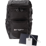 The Elevate Soleil Backpack w/ 8,000 mAh Power Bank is more than a name - it's an idea, one that shapes our thinking and inspires our design. The Soleil Backpack features a 5W solar panel that allows you to charge your devices while you are enjoying the outdoors. Cord pass through allow you to charge your 8000 mAh power bank which is included through the solar panel to ensure you have all the power you need. A USB port and cable is also included, as well as hidden front straps that you can clip to the synthetic rubber daisy chains down the front panel of the bag to hold jackets, sleeping bags, your drone or any other essentials. Features padded shoulder straps and back panel, a trolley sleeve, custom zipper pullers and signature Elevate branding.